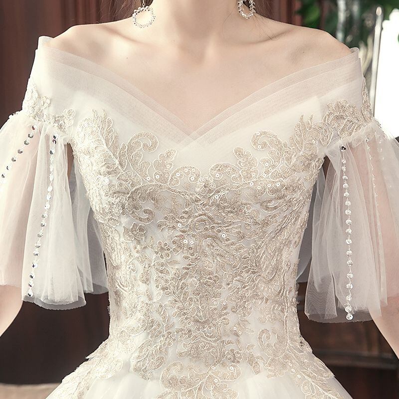 オフショルダーのスタイルは、女性らしさを引き立て、袖のふんわりしたデザインが優雅さを添えています。