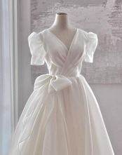 柔らかな素材と流れるようなシルエットが美しく、ウエストにあしらわれた大きなリボンが可愛らしさを引き立てています。
