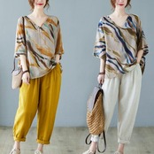 トップス ブラウス チュニック Vネック 七分袖 五分袖 ドルマンスリーブ ゆったり 総柄 マーブル 大理石 柄ブラウス リネン 麻 コットン 綿 ブルー イエロー