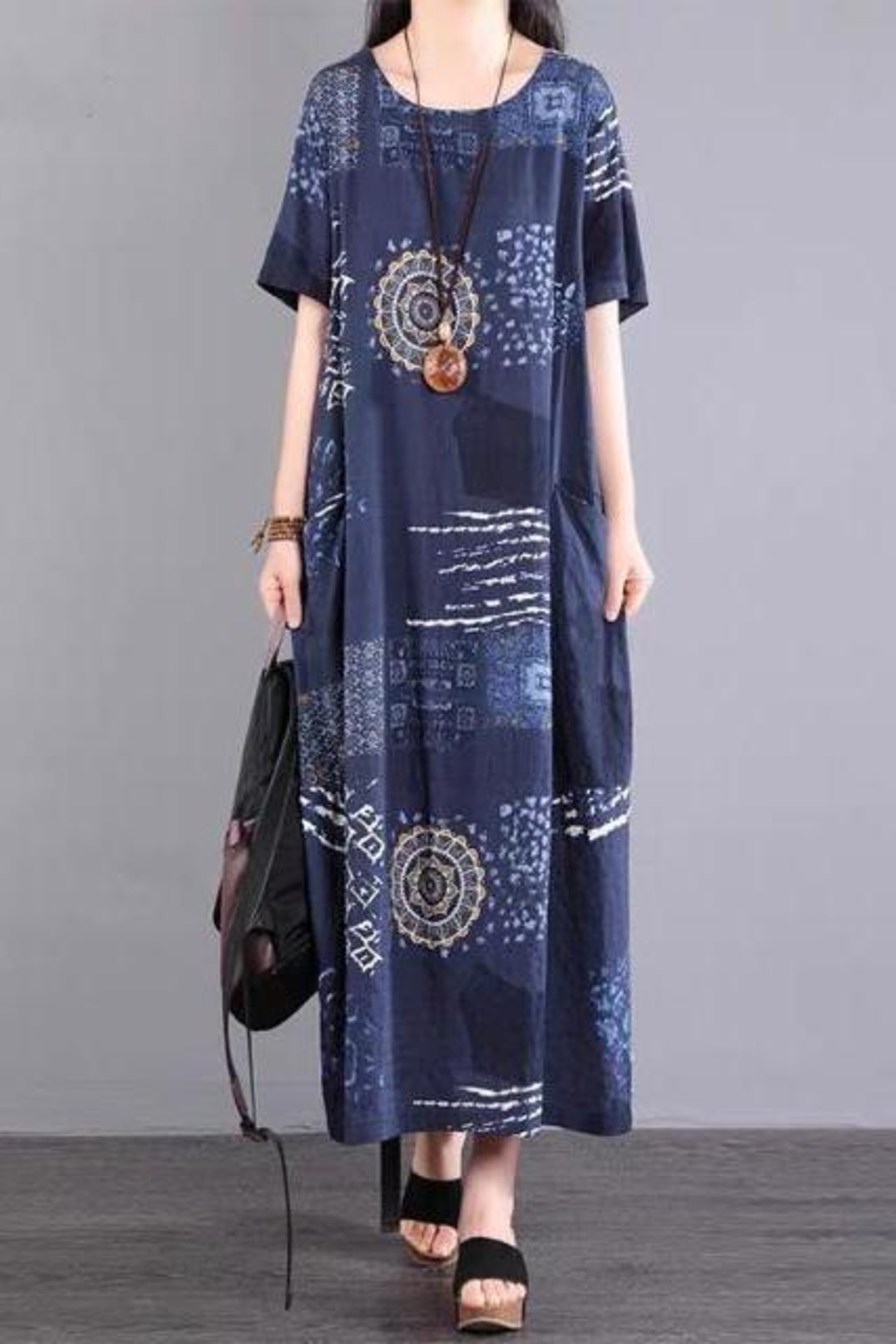 民族風の個性的なプリントが目を引くロング丈ワンピースです。通気性の良い綿麻素材で、春夏にぴったりの軽やかな着心地。ゆったりとしたシルエットで体型を自然にカバーし、リラックスして着用できます。両サイドに便利なポケット付きで、ちょっとしたお出かけにも便利です。存在感のある柄ながら落ち着いたネイビーカラーで、大人の女性にも合わせやすい一着です。