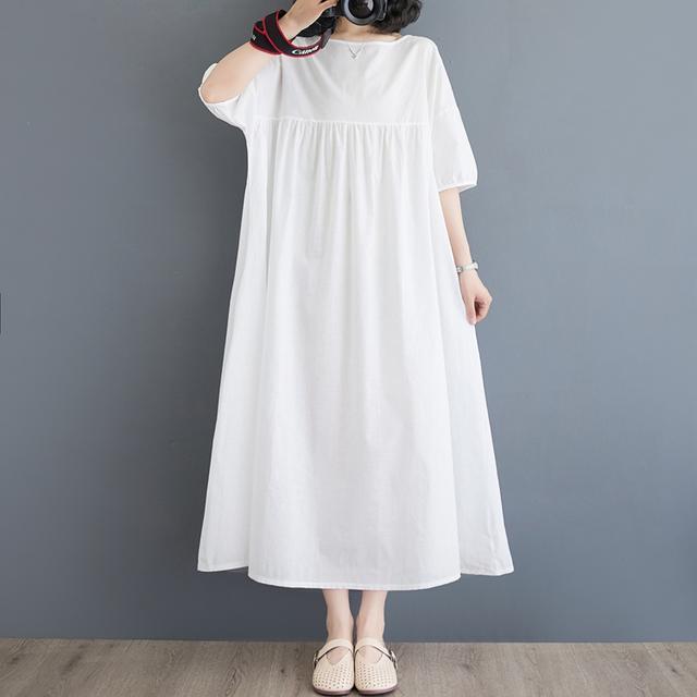 フレアワンピース レディース シャツワンピース フレア Aライン 綿麻 リネン風 5分袖 ロングワンピース ゆったり 大きいサイズ ホワイト