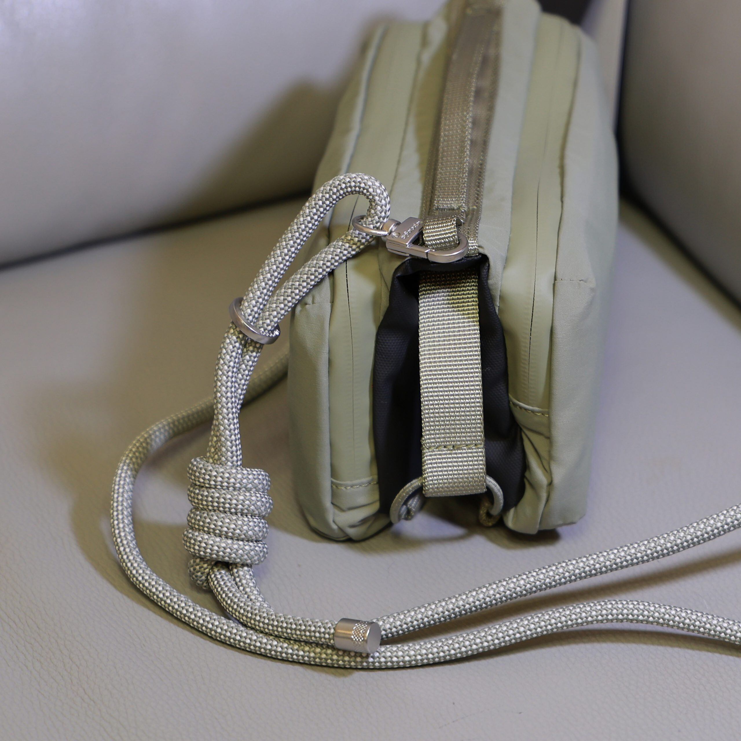タンブラーボトルと、スマートフォンやキー、財布などの持ち物も含めて便利に収納・持ち運びするためのサスティナブルなポーチ。