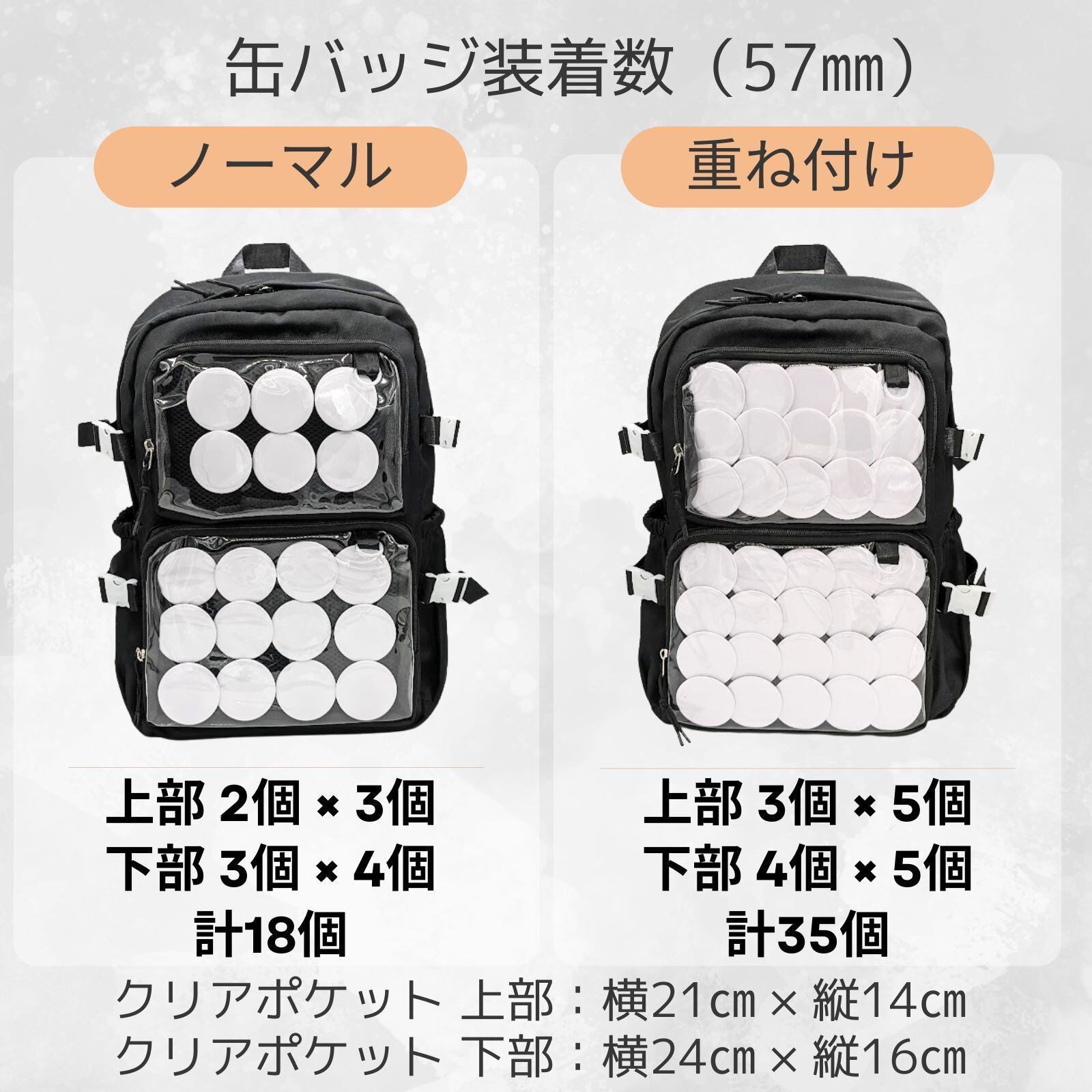◎ 透明部分が2段になっており、沢山推しをアピールできます。缶バッジ装飾用のメッシュシートも付属します!使いやすさNo.1の痛リュックです!
