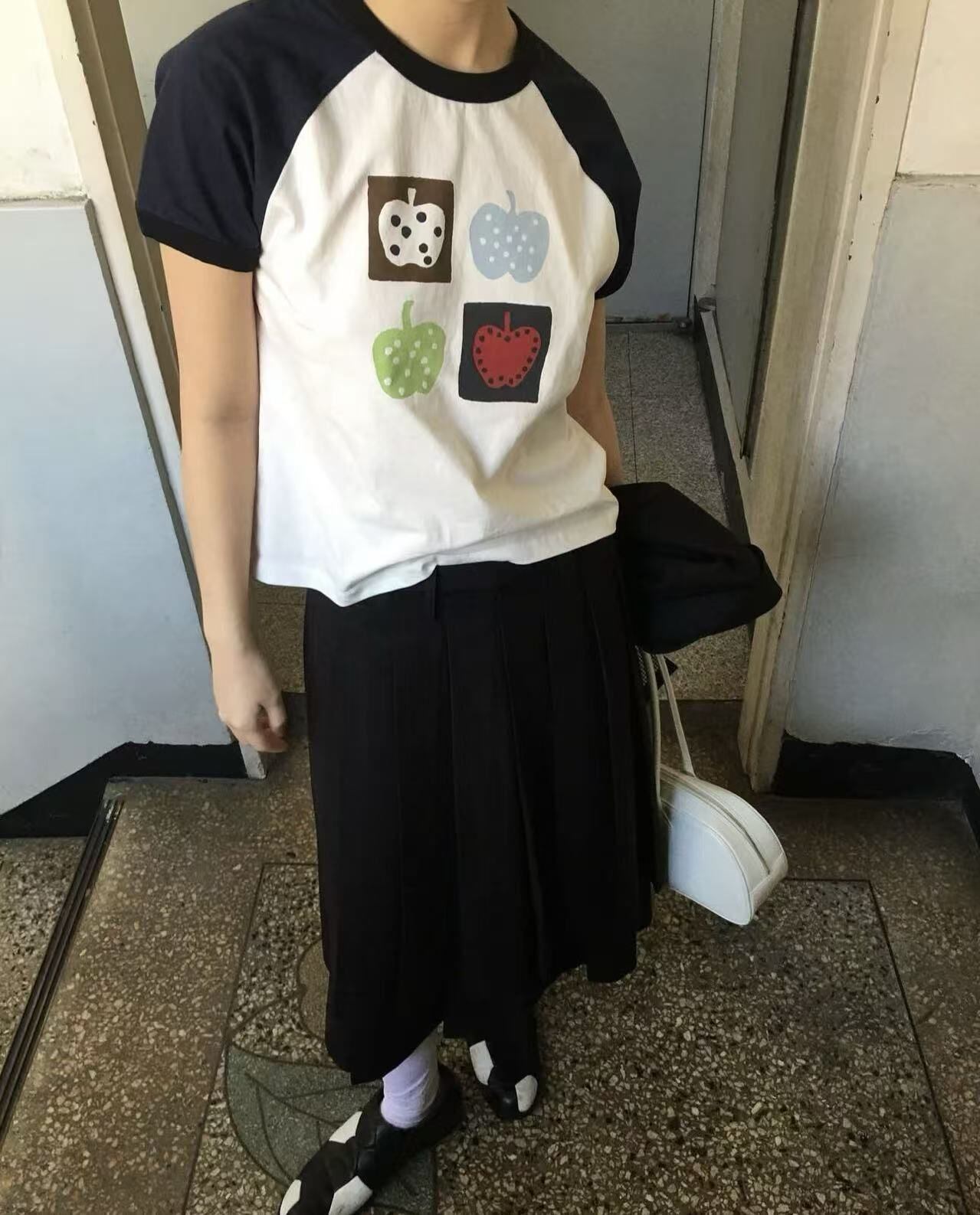 新品 韓国 OHESHIO APPLE RAGLAN T-SHIRT 人気 半袖 Tシャツ ファッション Y2K 人気 春夏 かわいい おしゃれ レディース【2色選択可能】