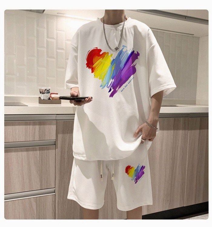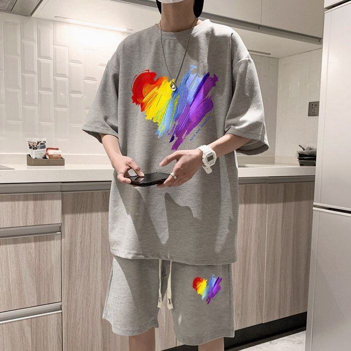 上下セット ゆったり プリント Tシャツ ハーフパンツ メンズ 半袖 ワッフル 夏 韓国 セットアップ ファッション ビッグTシャツ 上下 ショートパンツ ルームウェア 部屋着 運動着 ストリート ダンス