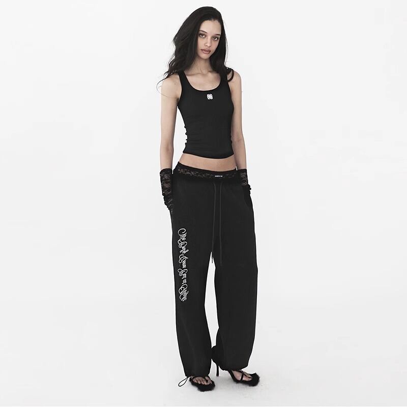 韓国人気 BADBLOOD バッドブラッド パンツ ボトムス レディース ロングパンツ カジュアルパンツ レース スウェットパンツ ゆったり おしゃれ Pure Lace Trim Jogger ブラック