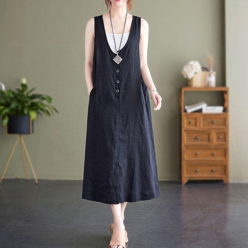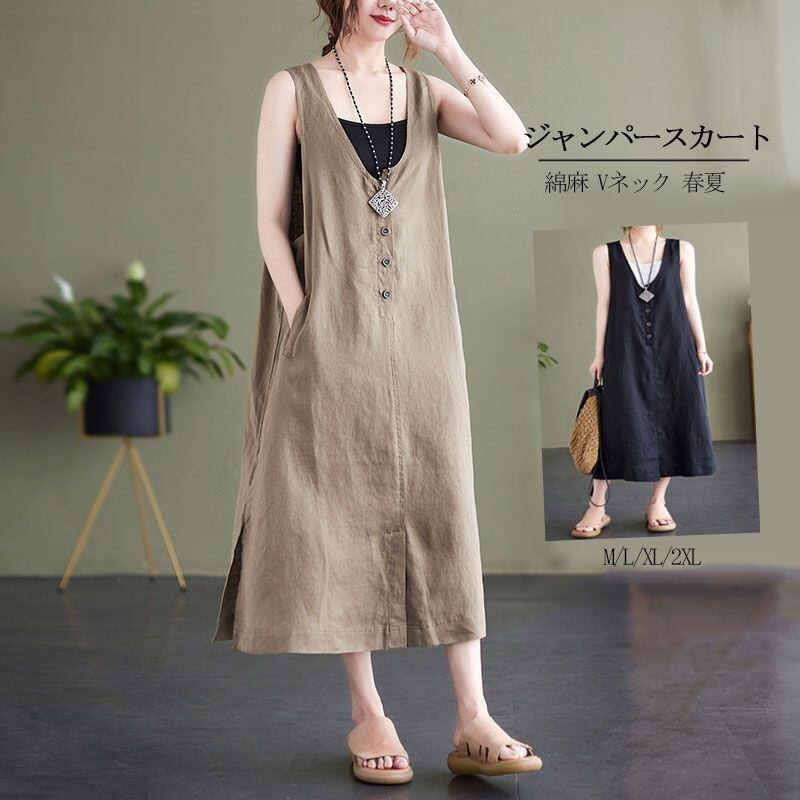ジャンパースカート レディース 春夏 ジャンスカ Vネック ボタン ロング ワンピース ノースリーブ サイドポケット ミモレ丈 無地 プルオーバー きれいめ 着回し 綿 Aライン ベストワンピース 通勤 コーデ オフィス 仕事 フォーマル 抜け感 大人 ナチュラル 洗える beibei02