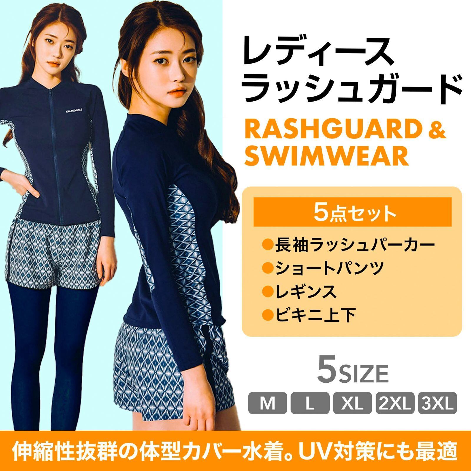 長袖ラッシュガード、ショートパンツ、レギンス、タンキニ上下の5点セット。