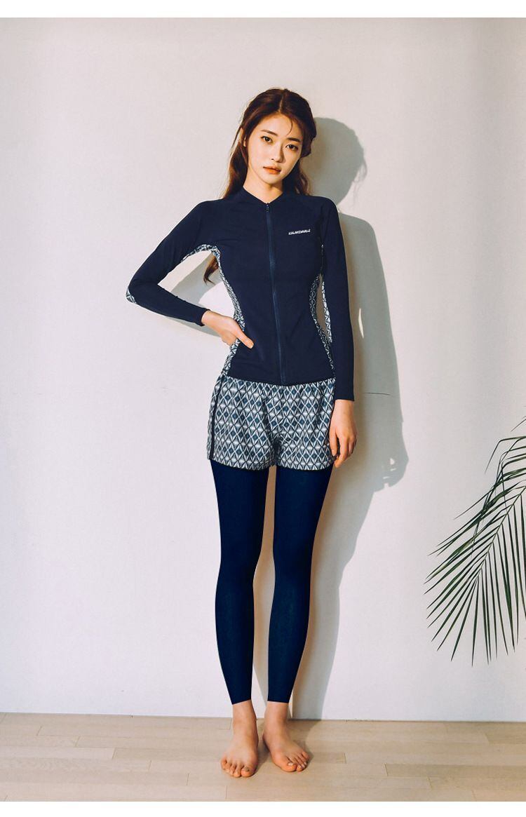 ラッシュガード レディース 水着 上下セット 体型カバー おしゃれ 長袖 セットアップ 5点セット フィットネス プール セパレート タンクトップ レギンス ショートパンツ シンプル ネイビー フードなし かわいい カップ付きshijie01