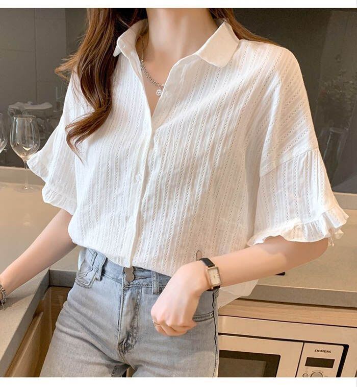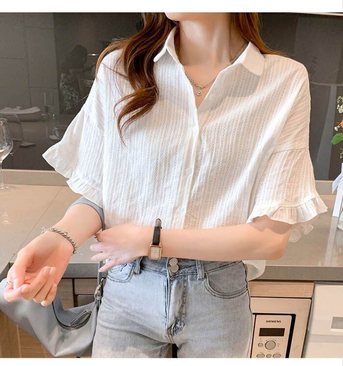 未使用 ブラウス レディース 半袖 シャツ 無地 袖フレア シャツブラウス トップス 白 ショート丈 ゆったり 体型カバー おしゃれ カジュアル きれいめ 可愛い オフィス 通勤 フォーマル yiman02