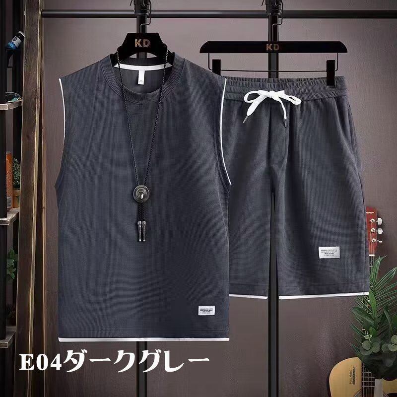 セットアップ ワッフル 無地 メンズ ジャージ タンクトップ スウェット上下セット ハーフパンツ 夏 ノースリーブ 運動着 スポーツウェアguixu01