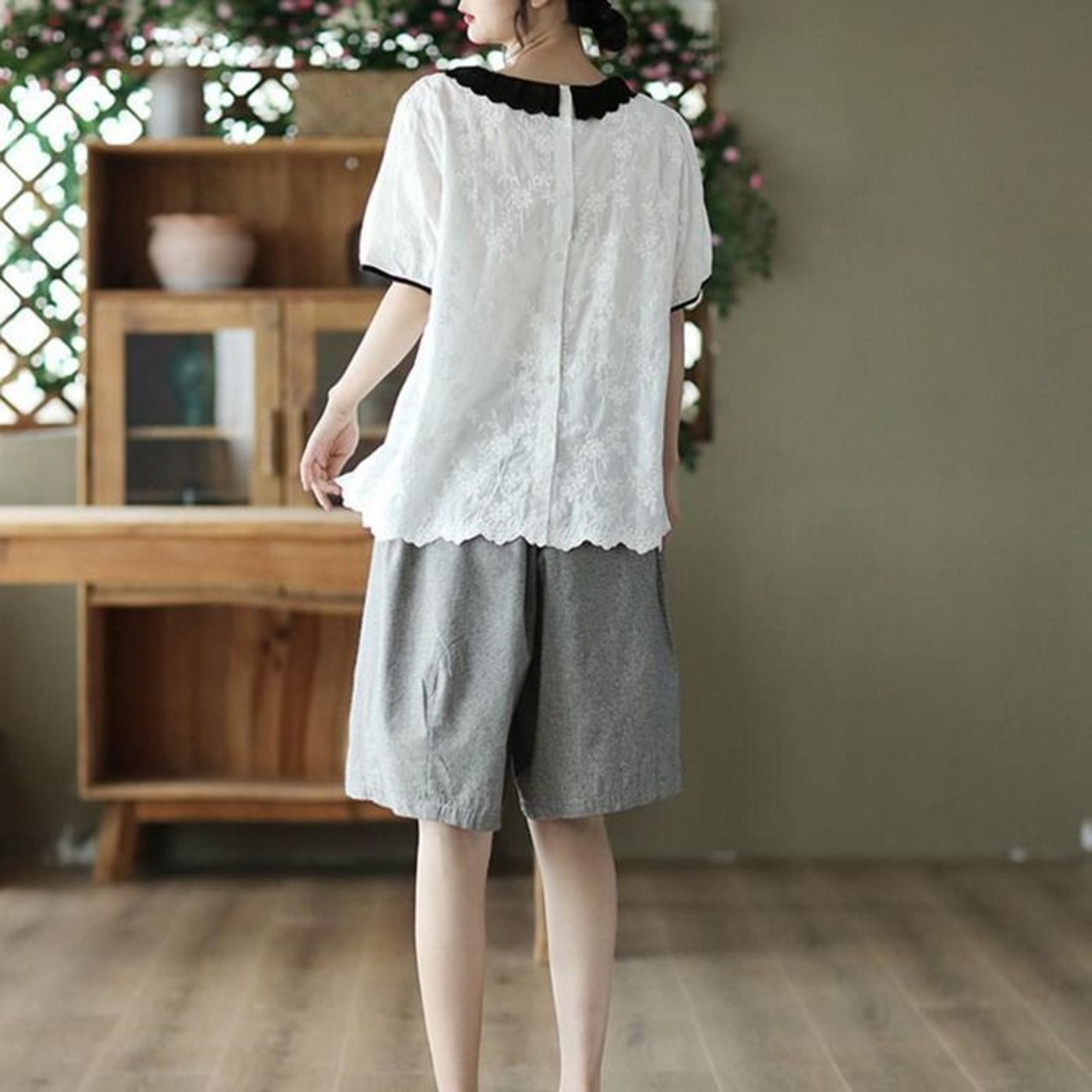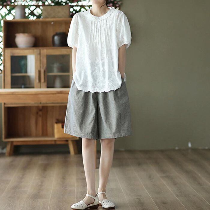 ブラウス クルーネック シャツブラウス レディース 半袖 プルオーバー ブラウス バックボタン コットンレース ゆったり タック入り 大きいサイズ 花刺繍 薄手 綿 日焼け止め トップス コットン 体型カバー 可愛い jueli01