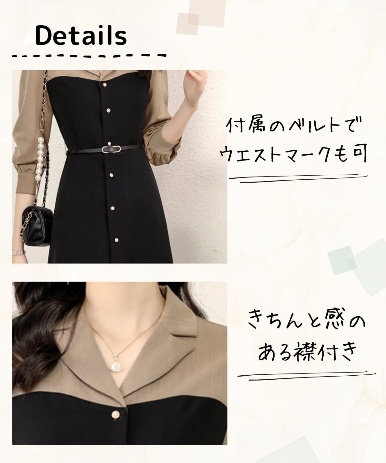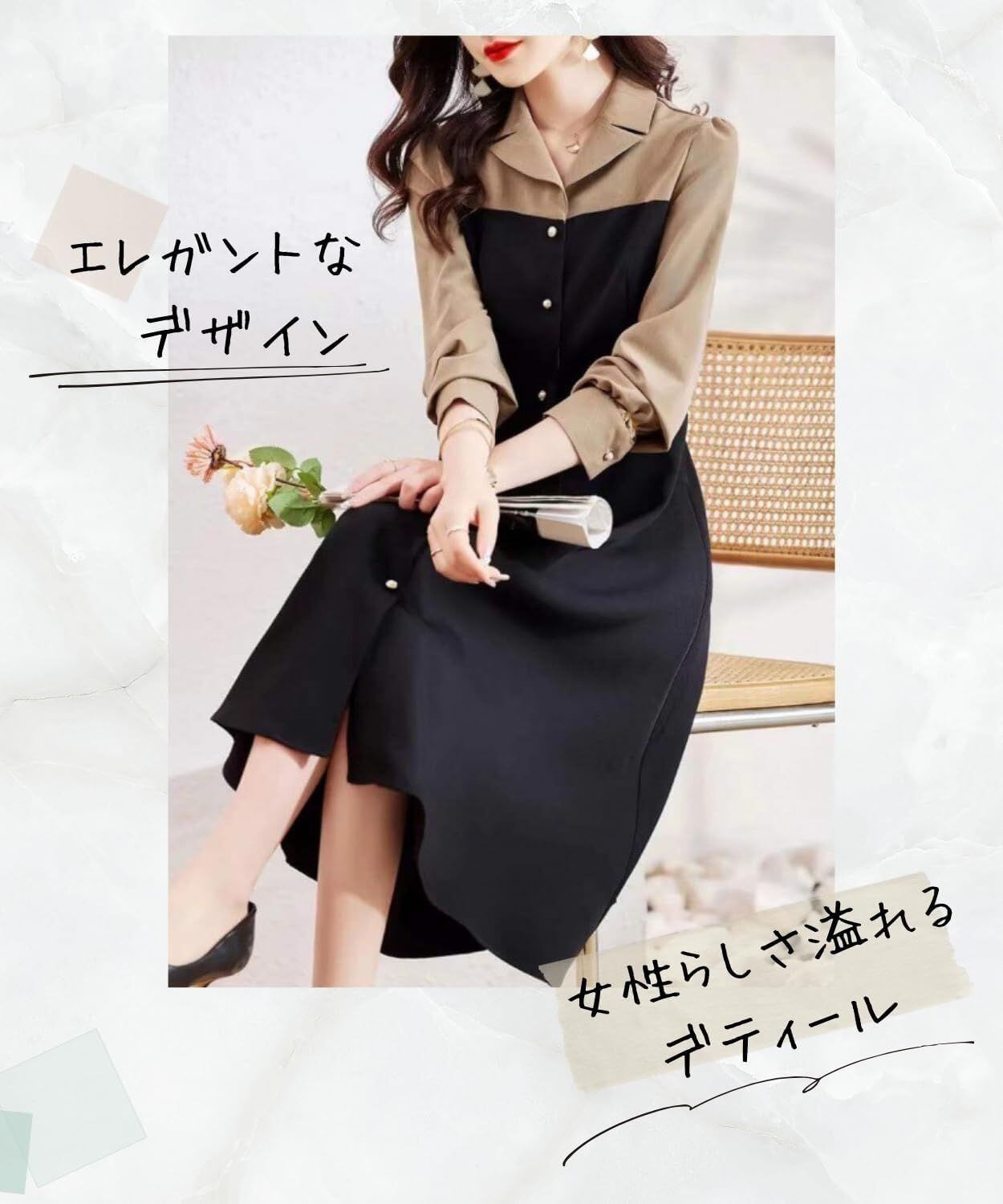 【幅広いシーンで活躍する一着】黒とベージュのバイカラーで、上品な印象のワンピースなので、通勤(オフィスカジュアル)から、デートや女子会、お呼ばれの場にもぴったりです。一枚でおしゃれに着こなせる、重ね着風のドッキングワンピース、春、秋は1枚で、冬はインナーや羽織をあわせて、季節を問わず着用いただけます。前ボタンの前開き仕様なので、授乳服としても便利です。