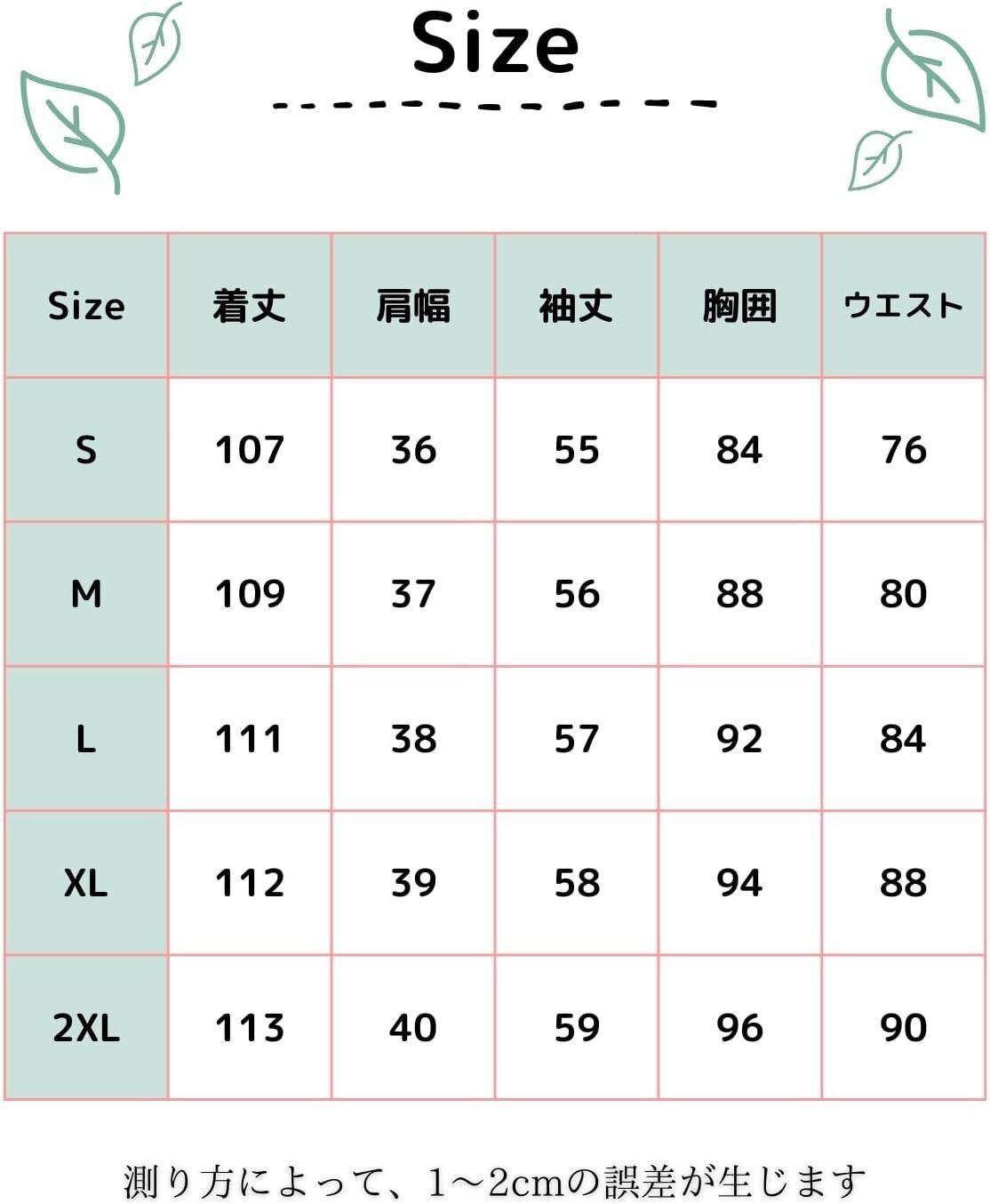 【サイズ】S/M/L/XL/2XLの5サイズ展開 小さいサイズから大きいサイズまで取り揃えています。《S》着丈:107, 肩幅:36, 胸囲:84,ウエスト76,袖丈:55 《M》着丈:109, 肩幅:37, 胸囲:88,ウエスト80,袖丈:56 《L》着丈:111, 肩幅:38, 胸囲:92,ウエスト84, 袖丈:57 《XL》着丈:112, 肩幅:39, 胸囲:94,ウエスト88, 袖丈:58 《2XL》着丈:113, 肩幅:40, 胸囲:96,ウエスト90, 袖丈:59