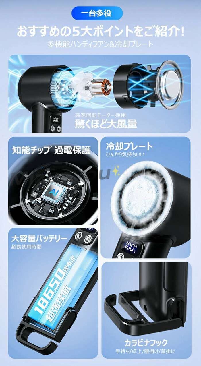 ハンディファン冷却 静音 首掛け 手持ち扇風機 携帯扇風機 大風量 超軽量 冷却ファン 冷却プレート付 100段階暴風 瞬間冷感 オススメ ハンド扇風機