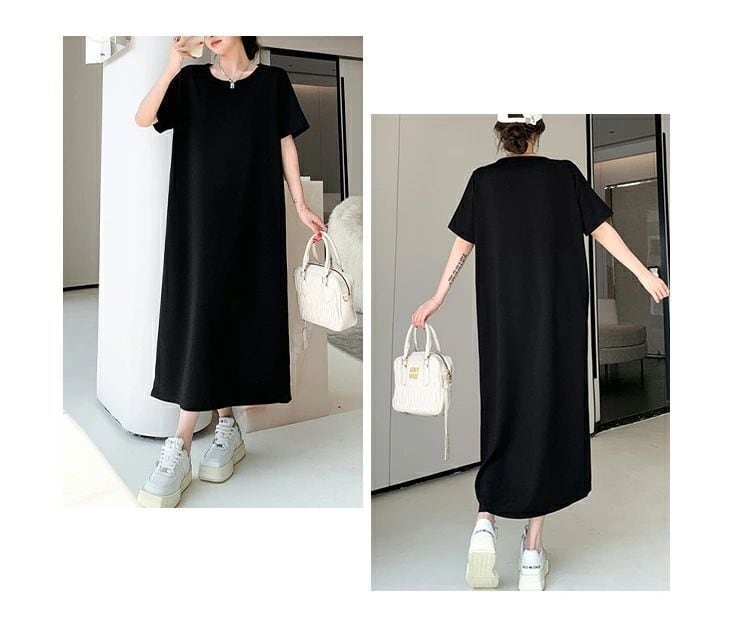 ワンピース ロング シンプル ワイド ゆったり 体型カバー 半袖 二の腕カバー マキシ丈 マキシ とろみ ブラック ベージュ 黒 春 夏 レディースファッション 20代 30代 40代 50代 60代