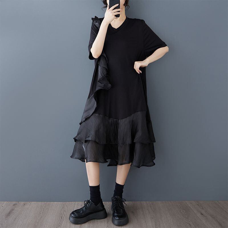 モード系 フリルトリム Vネック ハーフスリーブ 個性 ミディ プルオーバー ドレス ガーリーな印象のカジュアルアイテム 2色