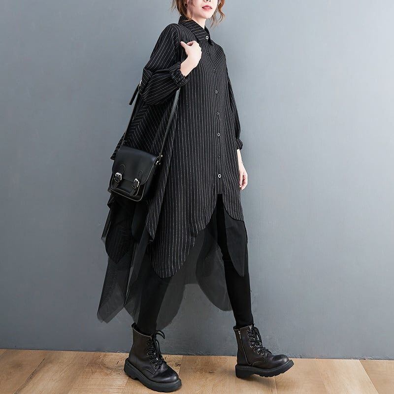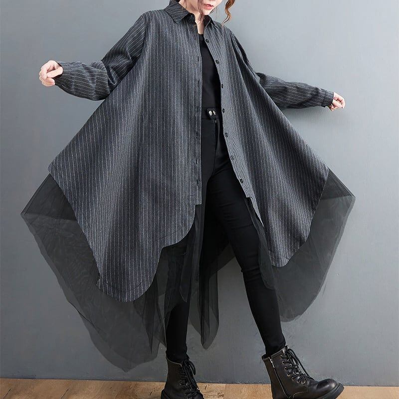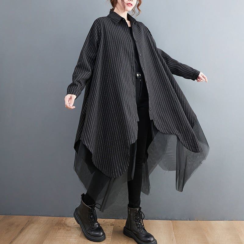 モード系 ストライプ ポロ襟 メッシュ レイヤード 個性 ヘム Aラインシャツコート 不規則 アシメトリ