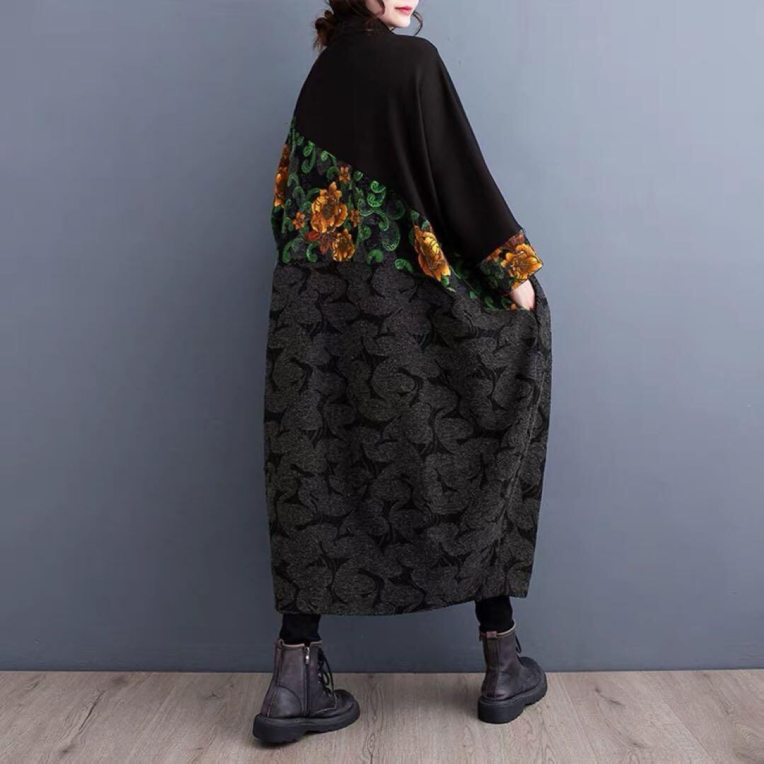 ニューデザイン モード系 ロングコート アウター 花柄 ゆったり 配色 カジュアルコート ロング丈 ワンポイント柄 フリーサイズ 秋冬