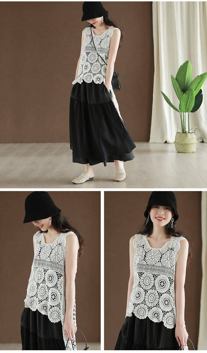 レース ベスト ノースリーブ 花柄 刺繍 後ろ長め 重ね着 不規則 ニット ジレ トップス 羽織り ロングベスト 総柄 透かし編み 個性的 タンクトップ レディース ゆったり コーデ xiangli01