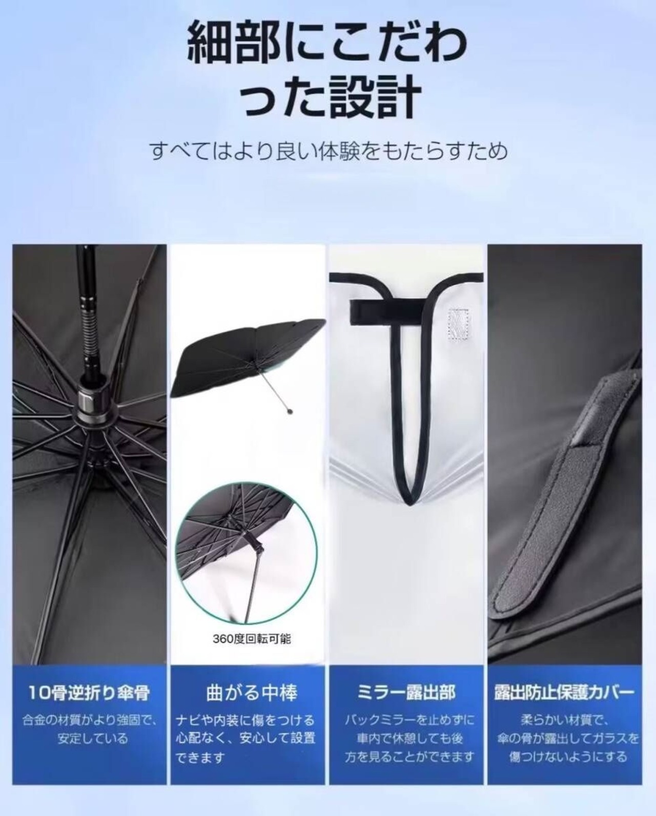 本製品は傘式なサンシェードの設計を採用し、従来の市販品のような難しい取付作業がなく、傘をささげるだけで利用できます。