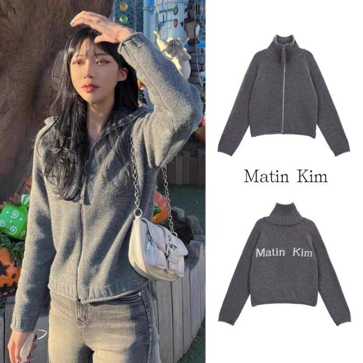 韓国 Matin Kim マーティンキム レディース セーター 長袖 ジップアップニット SPELL POINT KNIT ZIP UP グレー