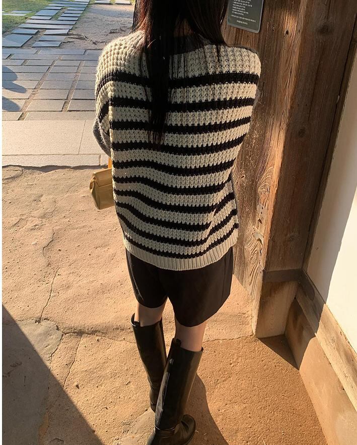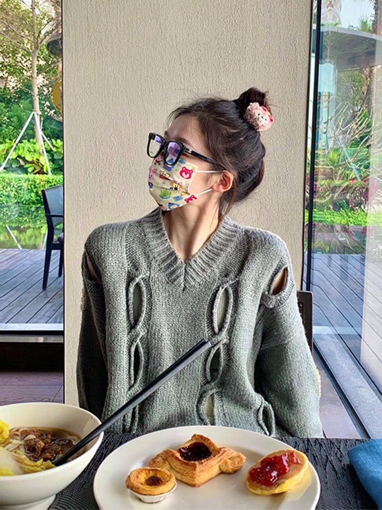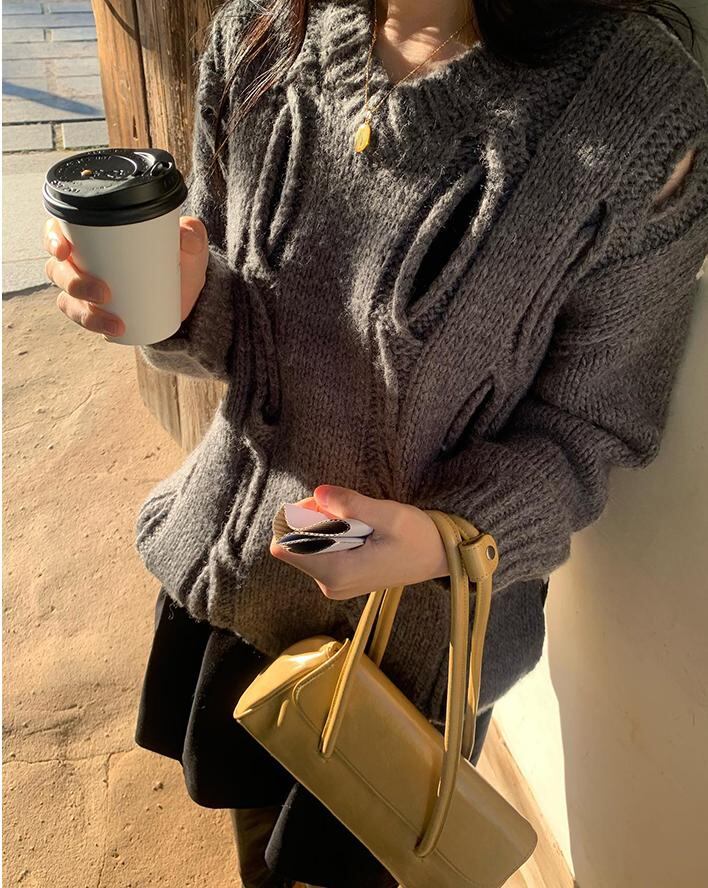 韓国 OPEN YY オープンワイワイ レディースファッション セーター ニット トップス 長袖 STRIPEBACK CUT-OUT KNIT SWEATER グレー