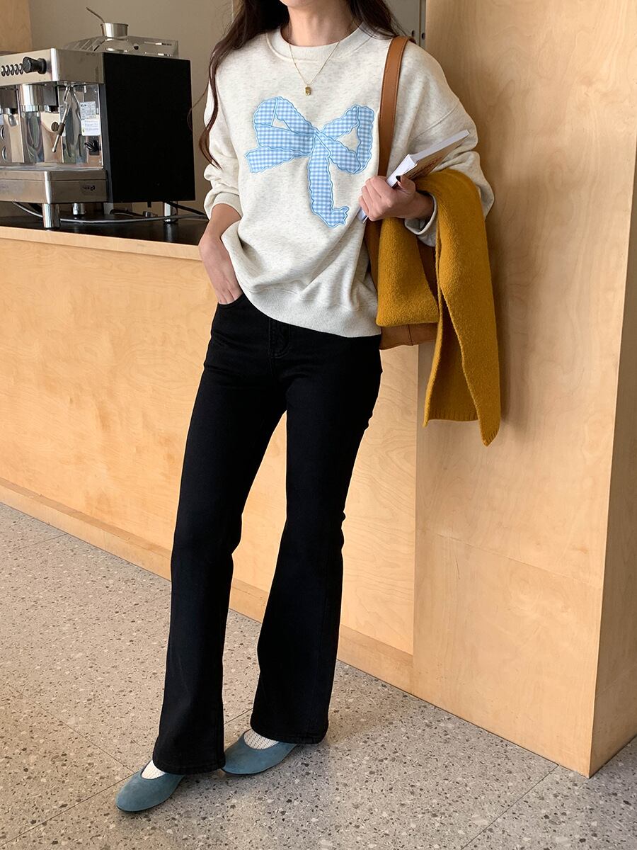 韓国 レディース ファッション リボンスウェット 長袖 トップス 可愛い クルーネック トレーナー オートミール色