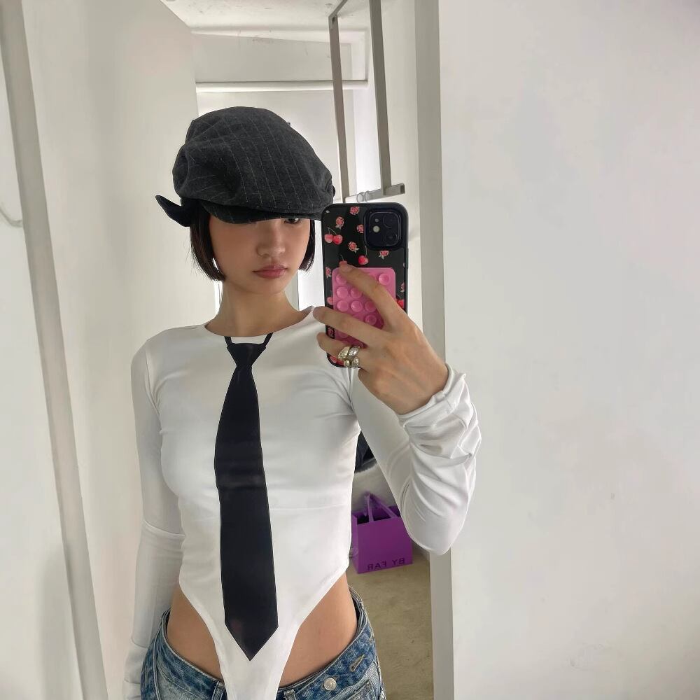 新品未使用 韓国 OPEN YY オープンワイワイ トップス 長袖 Tシャツ カットソー NECKTIE BODYSUIT