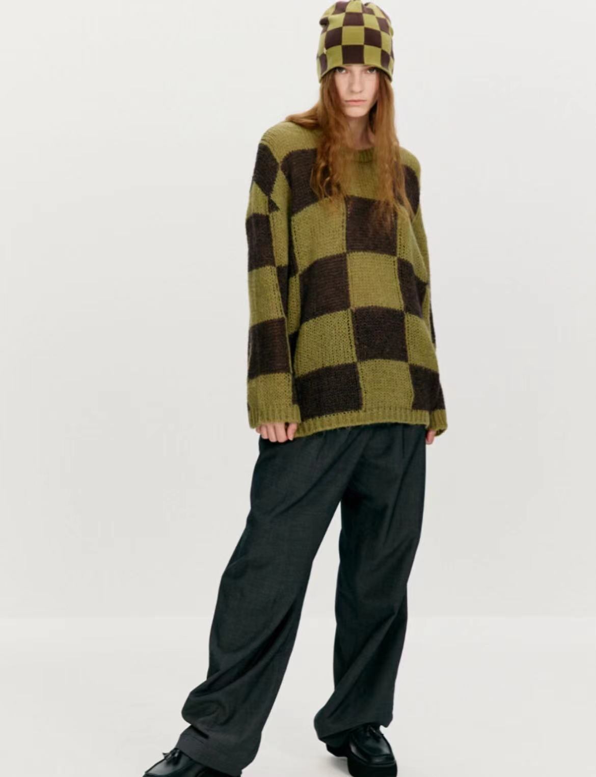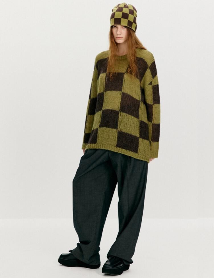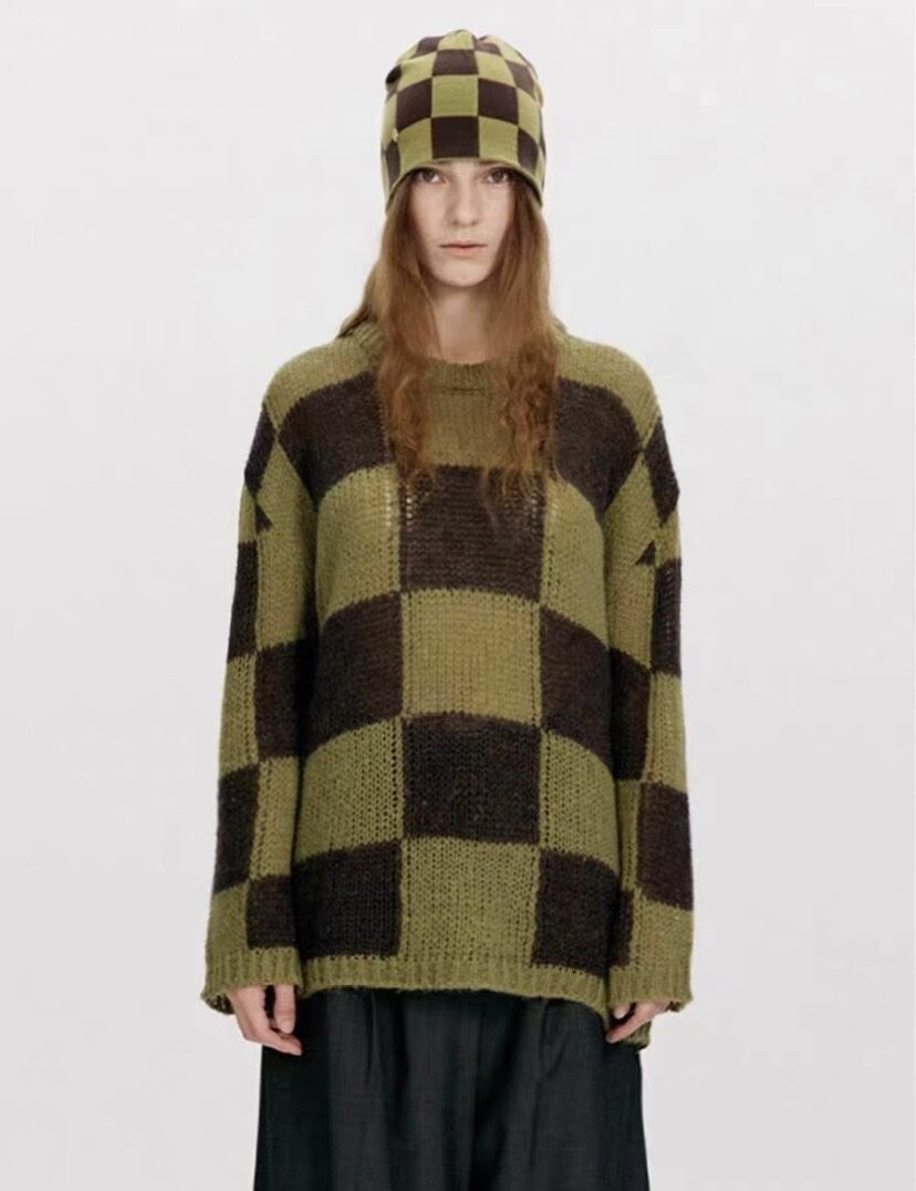 韓国 OPEN YY オープンワイワイ レディースファッション 透かし編み チェック柄ニットプルオーバ セーター Wool Blend Checker Board Sweater グリーン