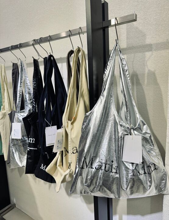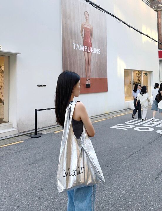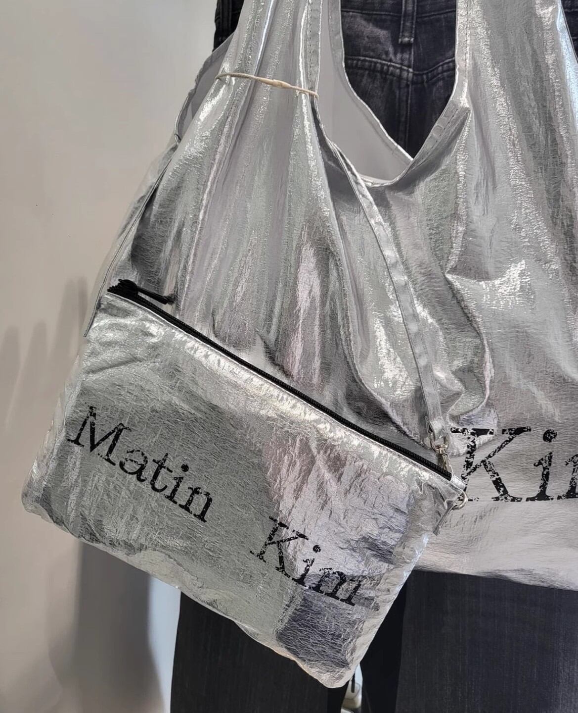 韓国 Matin Kim マーティンキム エコバッグ ショルダーバッグ レディースファッション MATIN CRACKED LOGO GLOSSY ECO BAG SILVER