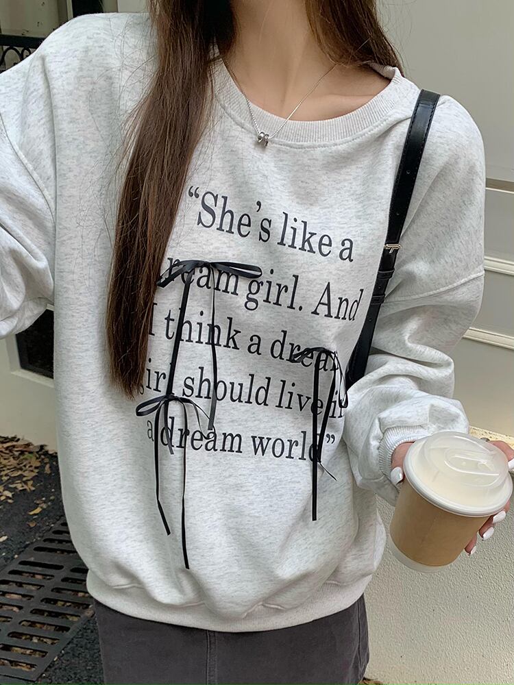 リボン付き レディース ファッション 可愛い 前プリントスウェット スウェット トップス 裏起毛なし グレー