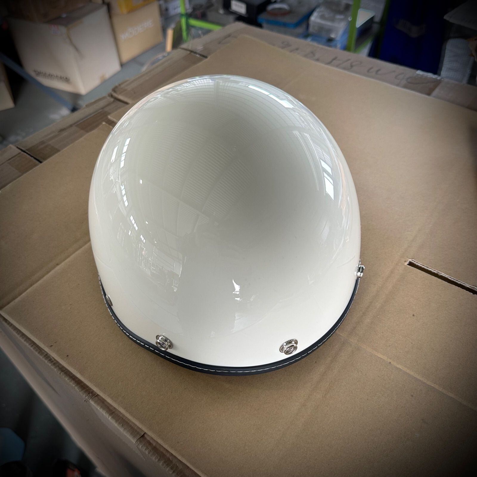 アイボリーの半帽スタイルヘルメット、黒色のバイザーとアジャスタブルストラップ付き。