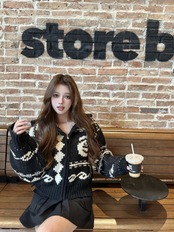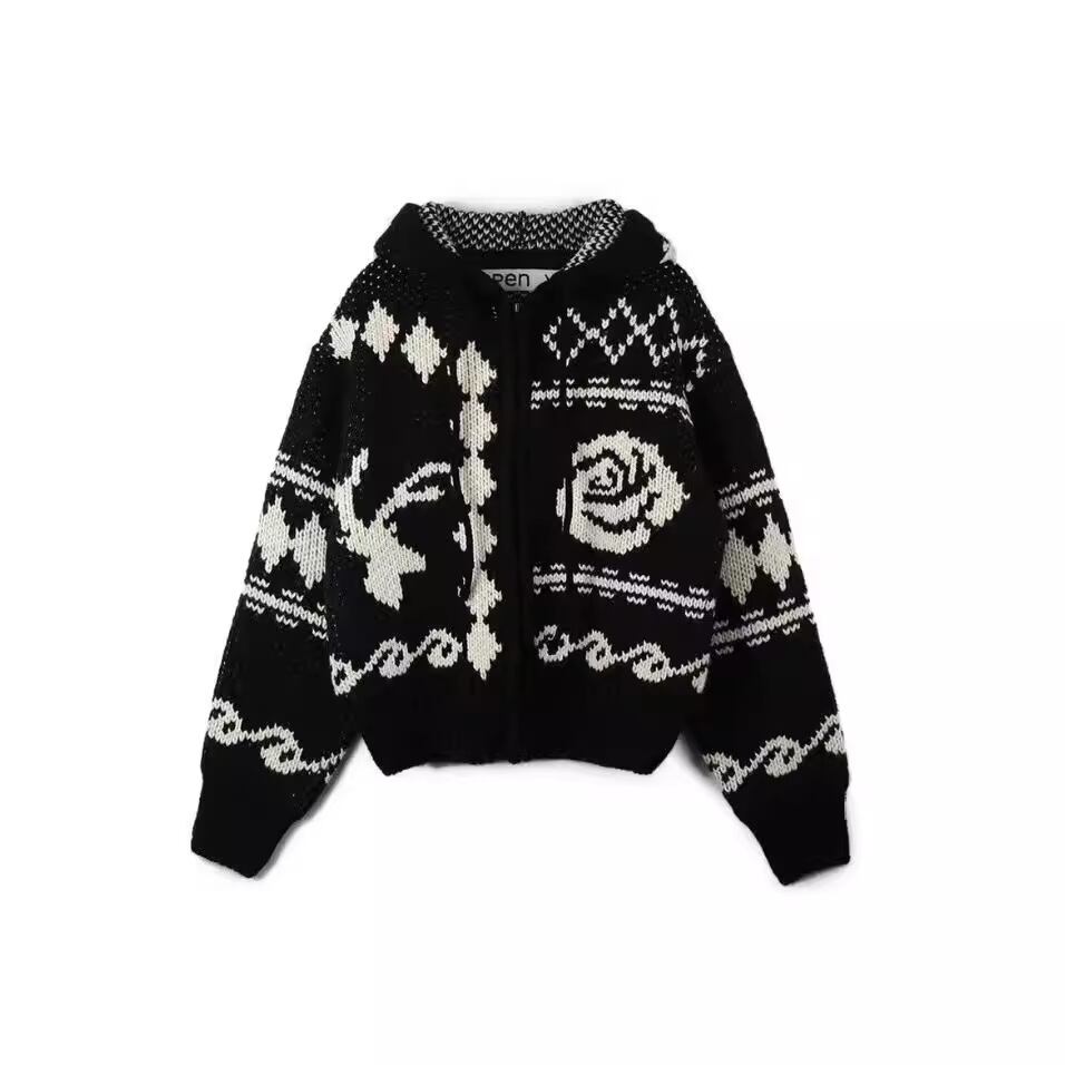 大人気 韓国ファッション OPEN YY_TheOpen Product オープンワイワイ_ザオープンプロダクト アウター ジャケット レディース ROSE & DEER JACQUARD KNIT JACKET BLACK