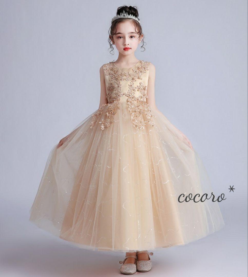 新作 パールレースデザインスパンコールロングドレス キッズ服(女の子用) シャンパンゴールド