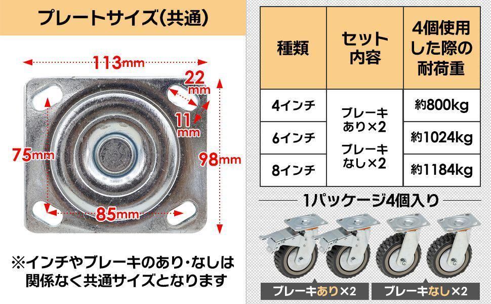 静音 台車用 車輪 産業用キャスター 6インチ 4個セット(ブレーキ有×2個,ブレーキ無×2個)