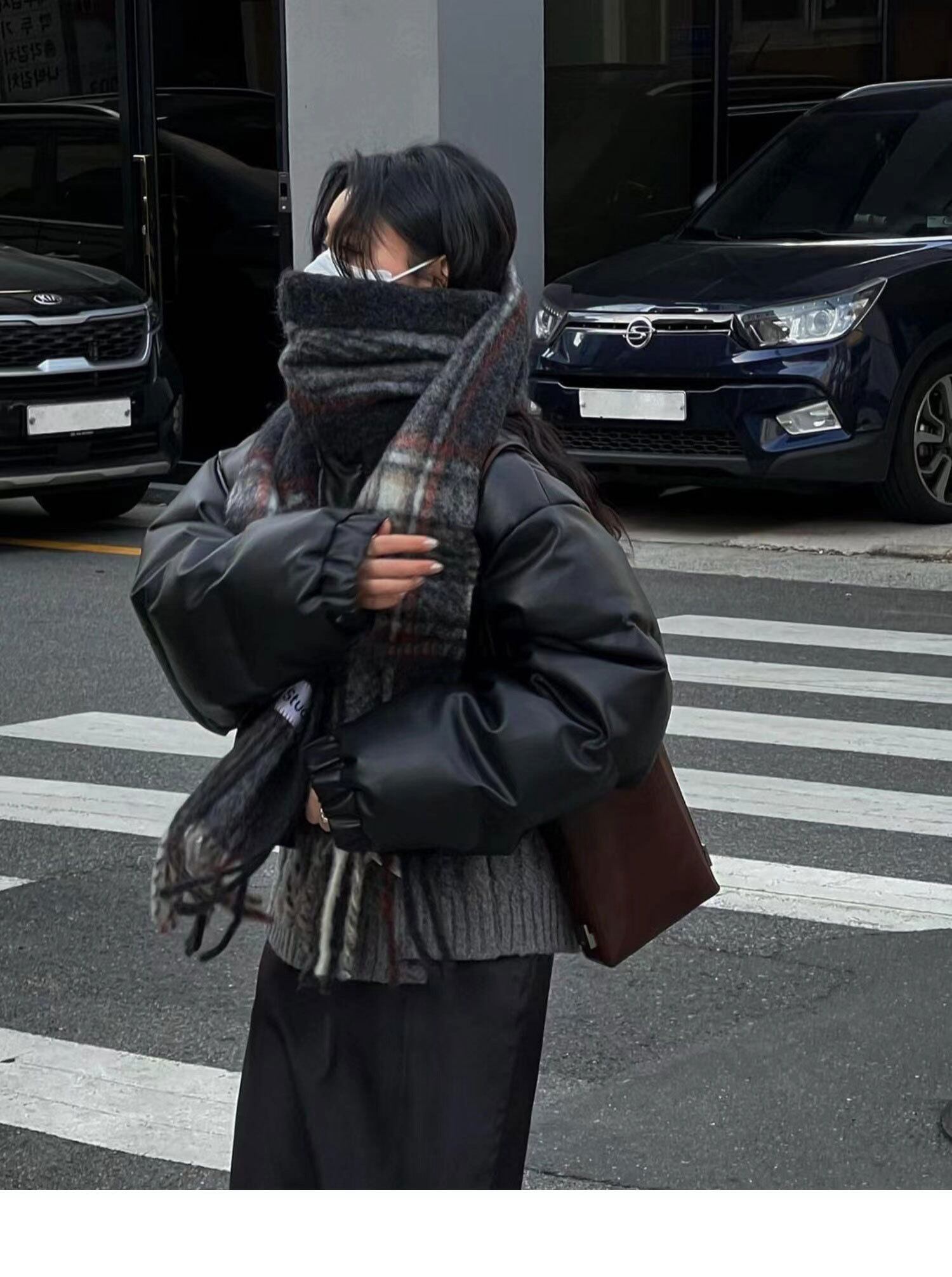 韓国風 ダウン ジャケット フェイクレザー クロップド ダウンジャケット