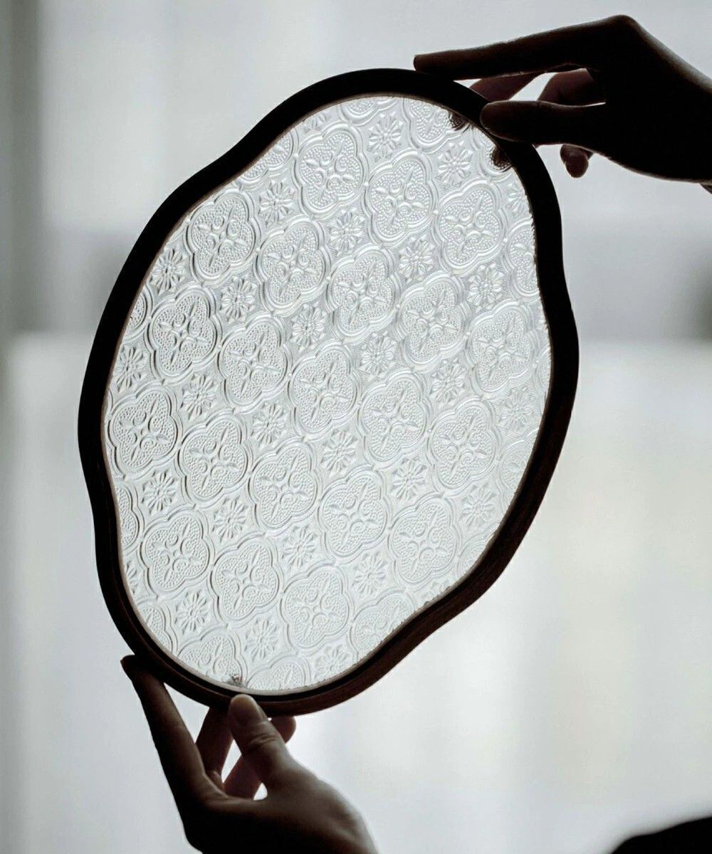 ◆素朴でどこか懐かしさを感じる模様と、視界を遮るすりガラスのさらざら感。模様が入っていない面は表面が少し波打っており、近代の洗練されたガラスには出せない不安定さを備えているのも、昭和型板ガラスの魅力です。