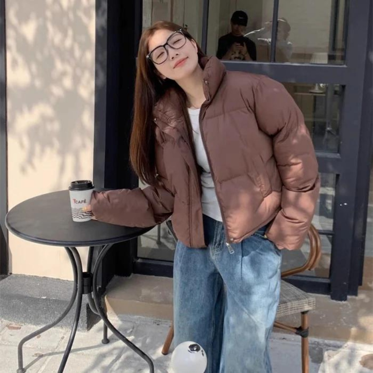 ショート丈 エコダウン ジャケット レディース 韓国 ファッション クロップド パデット 中綿 ボリュームジャケット ブラウン 冬 アウター