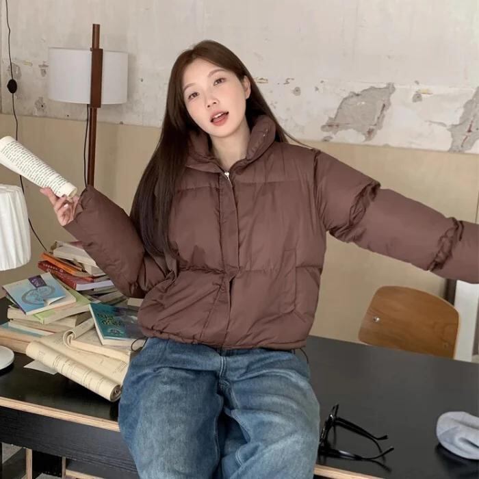 ダウンジャケット レディース 韓国 ファッション ショート丈 秋冬アウター 防寒 中綿 ブラウン クロップド ボリュームジャケット