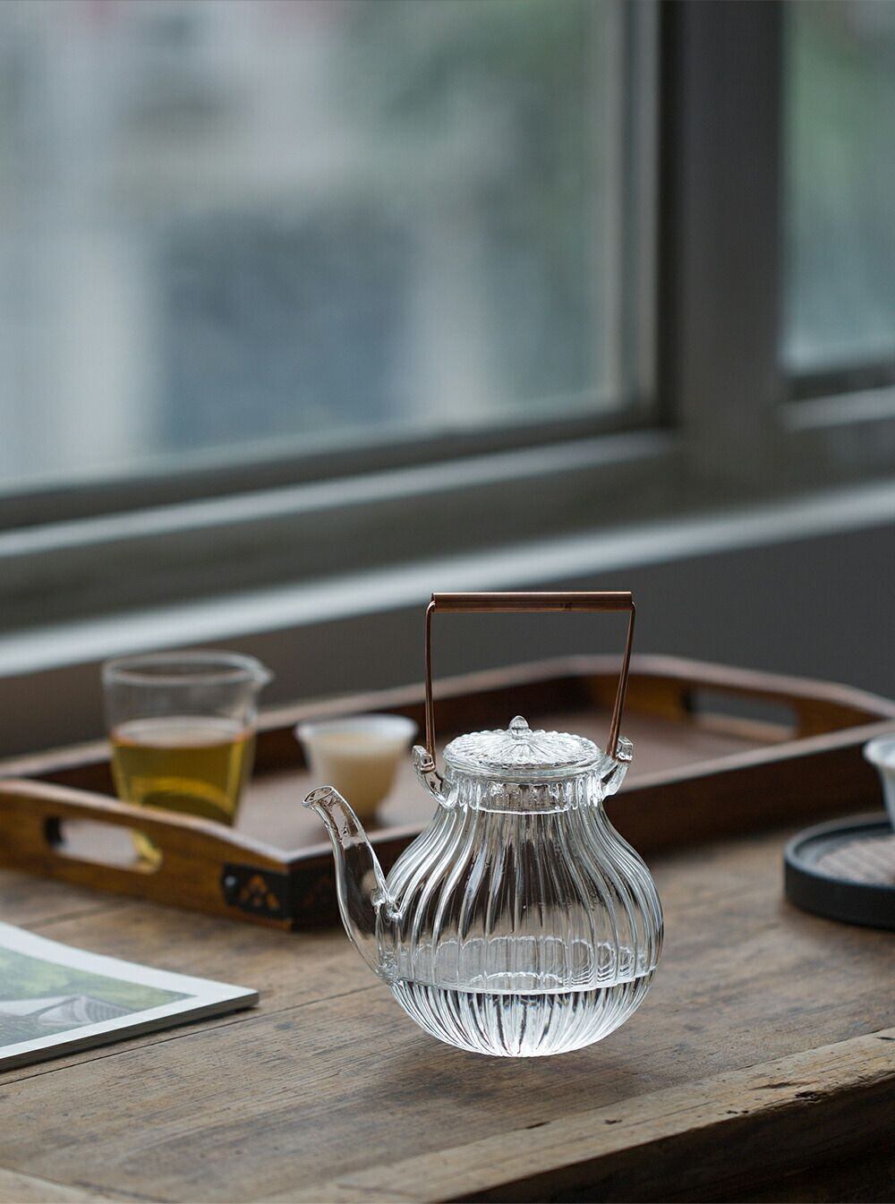 鶴首 耐熱ガラス ティーポット 茶こし付き ガラス製ポット 手作り 銅製持ち手 ジャンピング 紅茶ポット フルーツティー 花茶 工芸茶 ハーフティー に ガラス急須 健康茶器 直火可