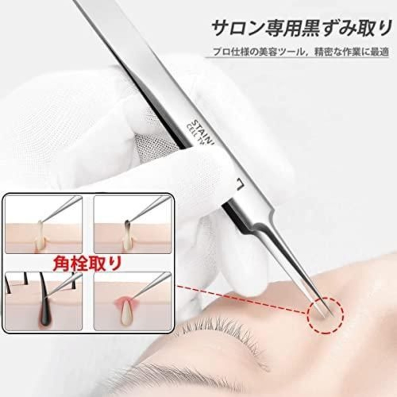 [極細チップ】:業界最低ラインを超える精密ピンセットで、チップ幅は0.1mm。これは髪の毛の直径の0.5倍です。 高精度、超精密ピンセットです。 ニキビの除去に役立つ、本製品は主に顔の角栓、特に鼻