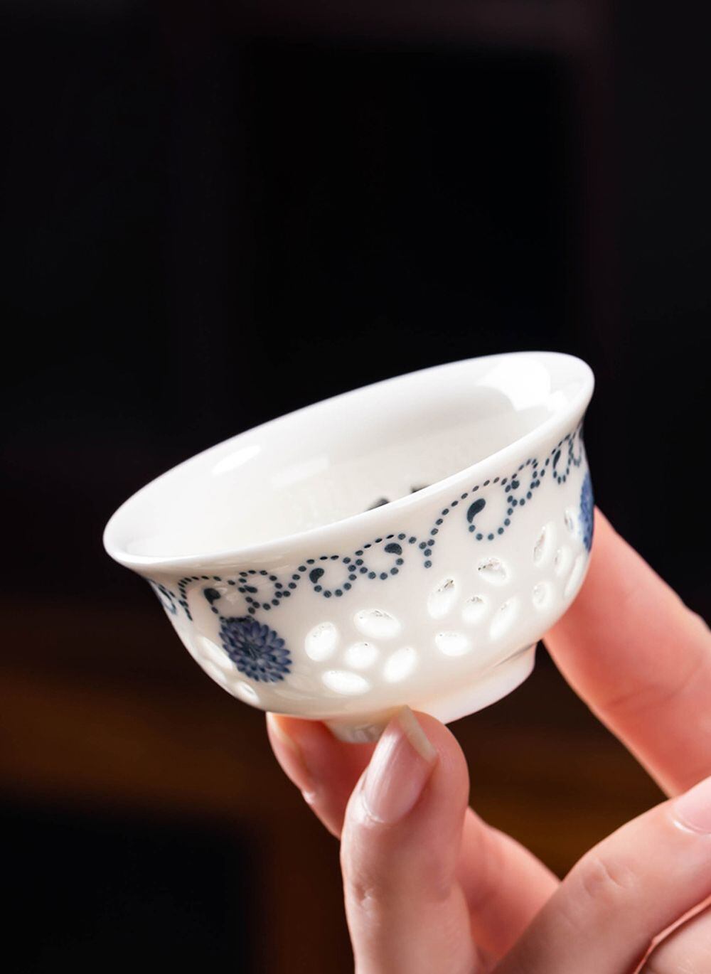 透かし模様で茶の色が見える玲瓏磁器 玲瓏磁 陶磁器 白磁 玲瓏 蓋碗 9点セット 太陽花宝瓶 茶器セット ティーセット 中国茶器 台湾茶 ウーロン茶 紅茶茶器
