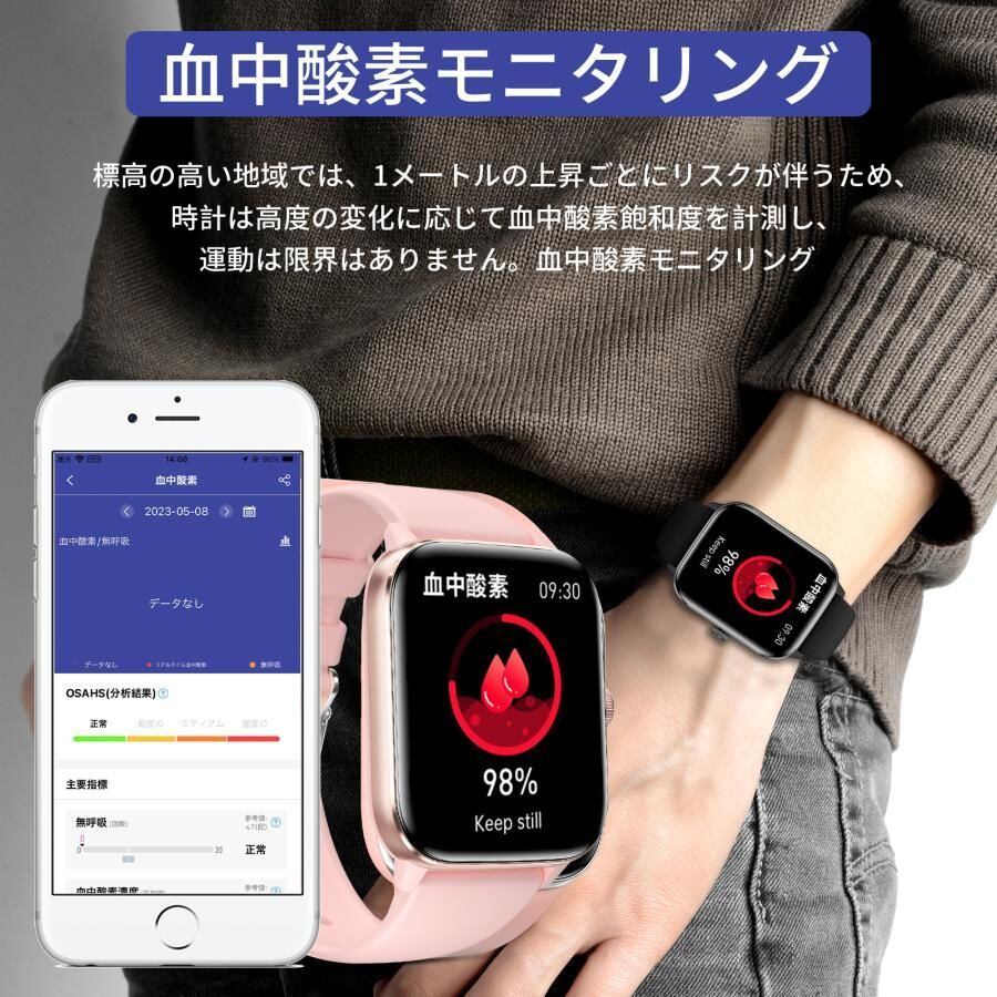 多機能:1.85インチの大字幕高精細なカラースクリーンで、血糖値測定、日付表示、歩数、心拍数、睡眠検測など毎日活動を正確に記録します。電話の着信通知と拒否、Gmail/SMS/Line/Facebook/Twitterなどメッセージ通知、ストップウォッチ、タイマー、遠隔撮影、腕上げ点灯、アラームなど生活面の機能も持っています。