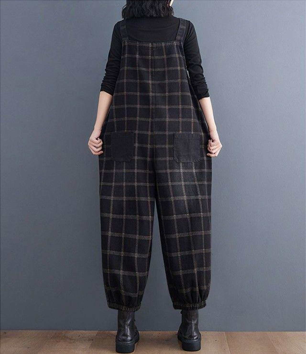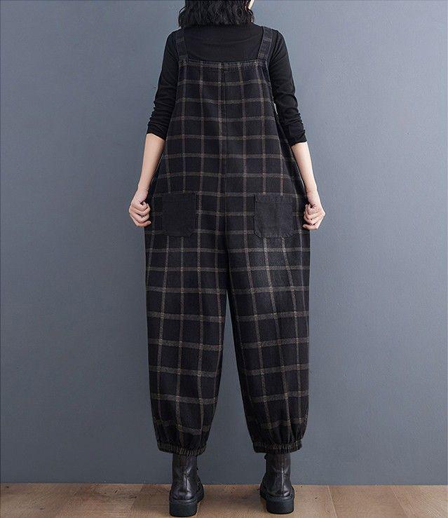 デニム サロペット オーバーオール チェック柄 ゆったり 秋物新作 ポケット付き