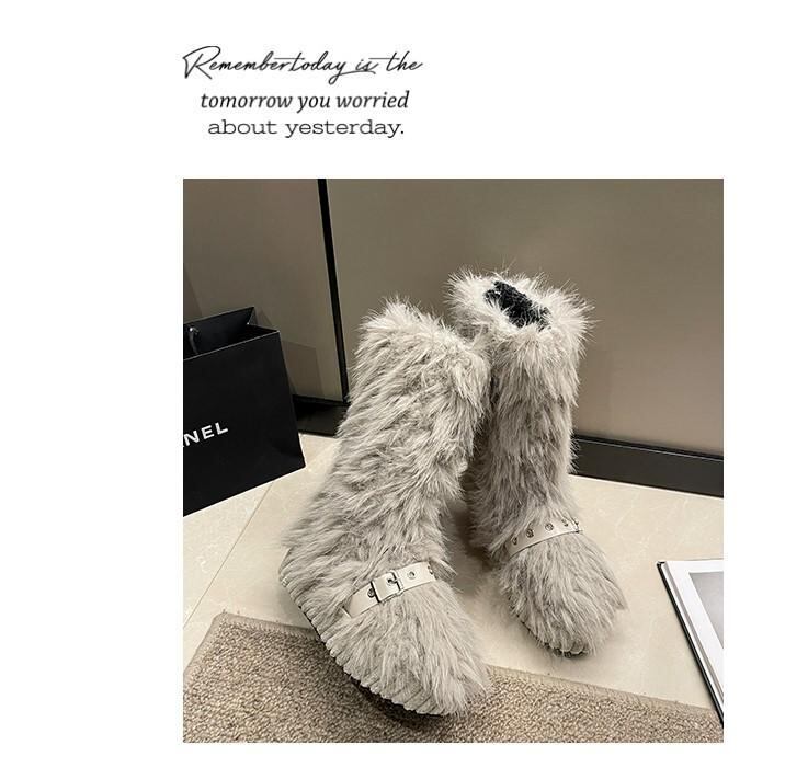 冬にぴったりのファーブーツ!ヒールデザインで、オシャレに足元を演出。暖かさとスタイルを兼ね備えた一足です。街を歩けば注目されること間違いなし!あなたのスタイリングを格上げするアイテムです。さあ、冬のおしゃれを楽しもう!