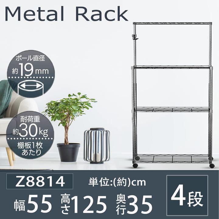 メタルラック本体 幅55×奥行35×高さ125cm 4段 ポール径19mm ラック キャスター付き スチールラック 防サビ加工 耐荷重100Kg