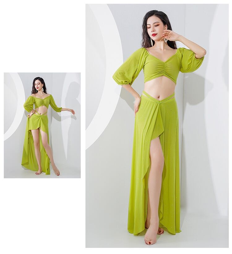 ベリーダンススカート セクシーな女性のダンス ショーの服オリエンタル フリル袖サイド スリット ロング スカート シャイン水糸ベリーダンス12e
