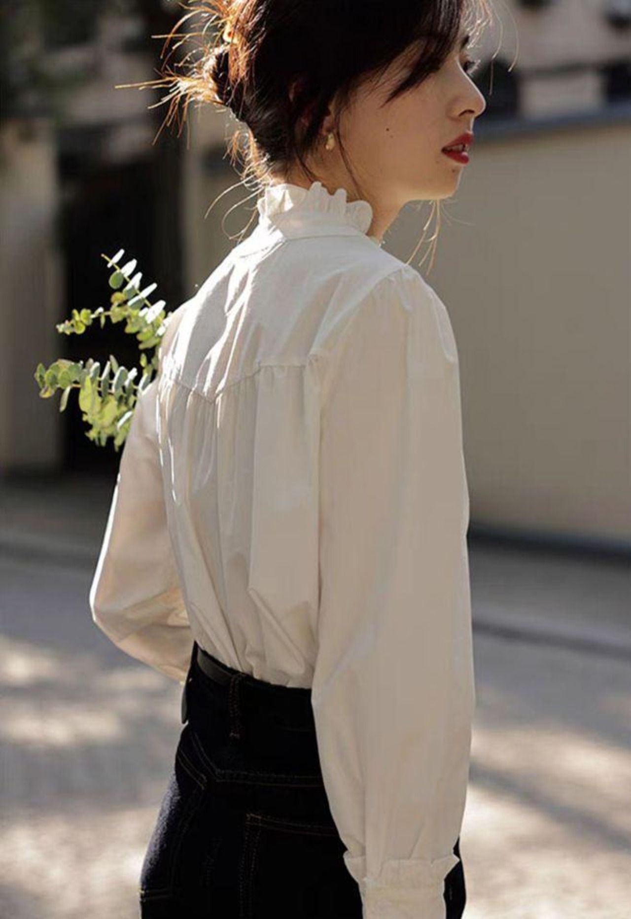 甘すぎない上品なスタンドネックのフリルシャツ。