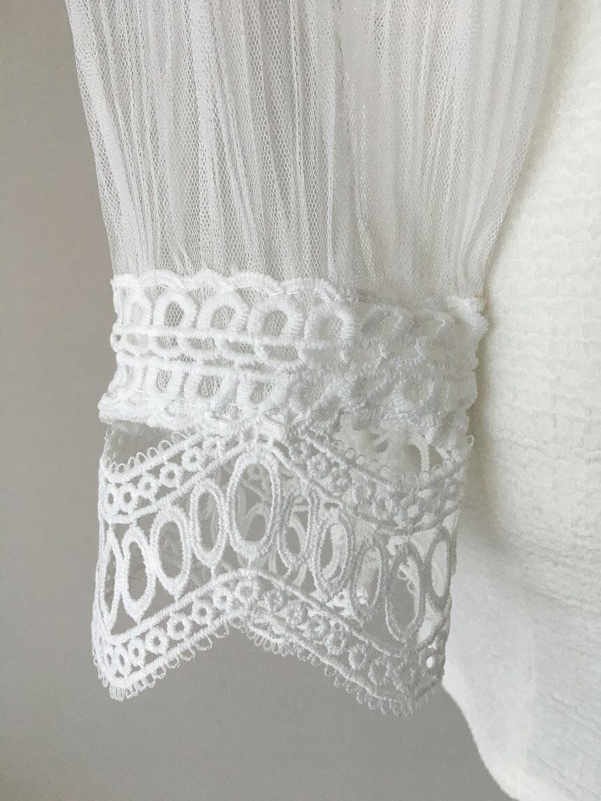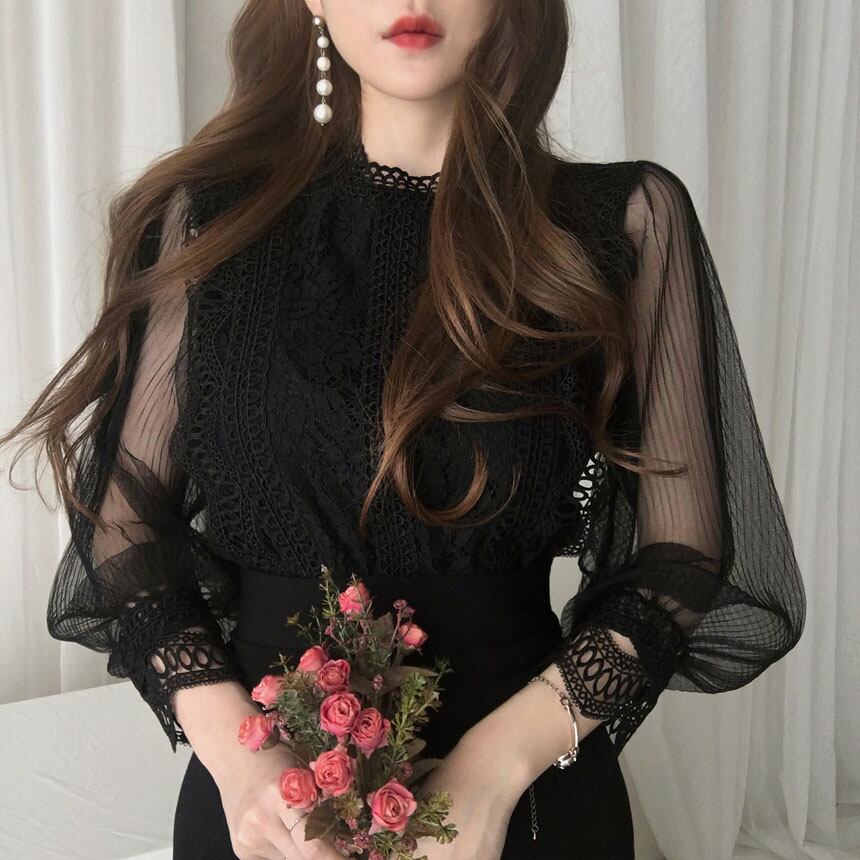 シャツ シースルー パフスリーブ 刺繍レース ブラウス 全3色